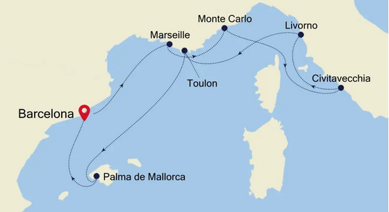 At 5:45 I did six lengths of the long, very warm, salt water swimming pool, followed by 2 x 6 minutes in the port jacuzzi with a view of the Jewish mountain (Montjuic) looming over us. At 6:45 we had the introductions by the pool. At 7:30 I gave my 40 minute lecture on Marseille.