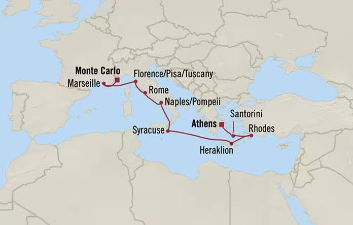 1) "Rhodes: Island of the Knights" 2) "Heraklion: Capital of Crete" 3) "Syracuse: Home of Archimedes" 4) "Naples: the Port for Pompeii" 5) "Civitavecchia: the Port for Rome" 6) "Livorno: the Port for Tuscany" 7) "Marseille: Second City of France!