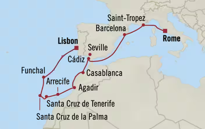 1) "Barcelona: Art Nouveau City 2) "Cadiz: Europe's Oldest City? 3) "Casablanca: Commercial Capital of Morocco" 4) "Agadir: Morocco's Premier Seaside Resort" 5) "Arrecife: Capital of Lanzarote" 6) "Santa Cruz: Capital of Tenerife" 7) "Lisbon: Capital of Portugal"