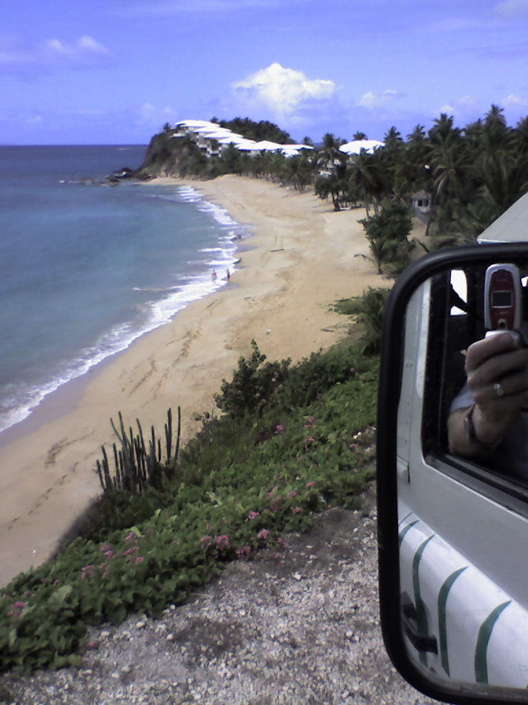 Back in my suite, I updated this blog and prepared my backpack for the beach. Just after eight o'clock I went to the Constellation theatre to collect my bus ticket for the Island Safari & Beach tour. We had a short walk to a shore side parking lot to get on to the back of the open sided minibus. We had a guided drive across the island to get to Grace Hill where I had TWO glasses of rum punch. There was a well preserved Moravian protestant church here, built of the local stone.