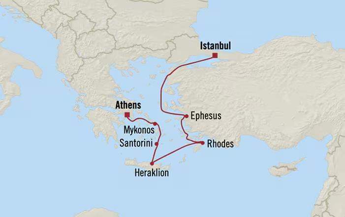 1) "Kusadasi: the Port for Ephesus" 2) "Rhodes: Island of the Knights" 3) "Heraklion: Capital of Crete" 4a) "Santorini: the Island of Saint Irene" and 4b) "Mykonos: Paradise Island" 5) "Athens: Capital of Greece"