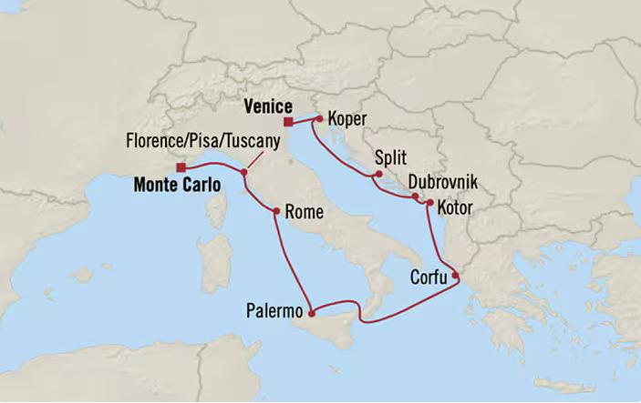 1) "Civitavecchia: the Port for Rome 2) "Palermo: Capital of Sicily" 3) "Corfu: the Door to the Adriatic" 4) "Kotor: UNESCO World Heritage Site" 5) "Dubrovnik: the Pearl of the Adriatic" 6) "Split: the Big Town" 7) "Koper: the Port of sLOVEnia"
